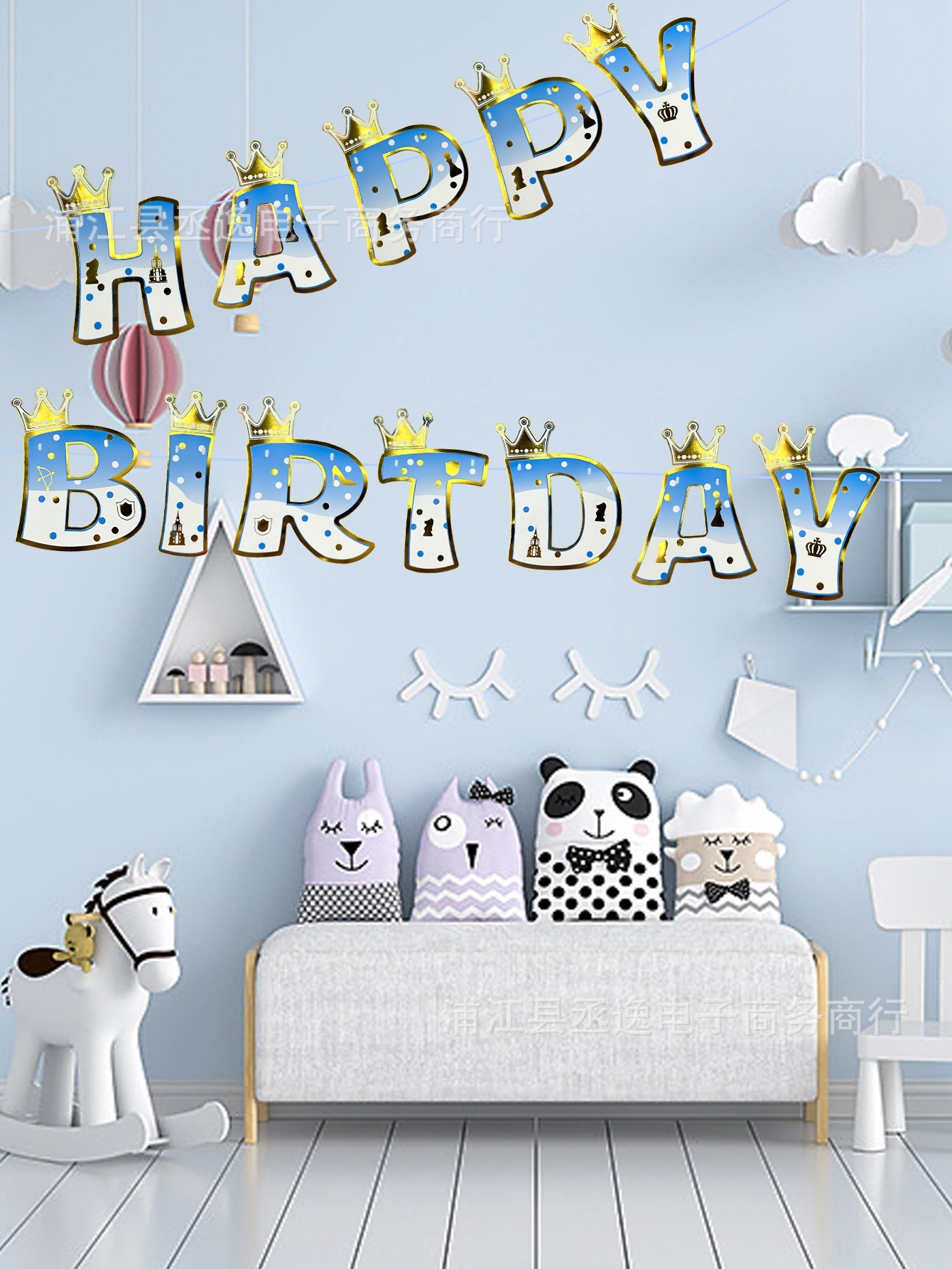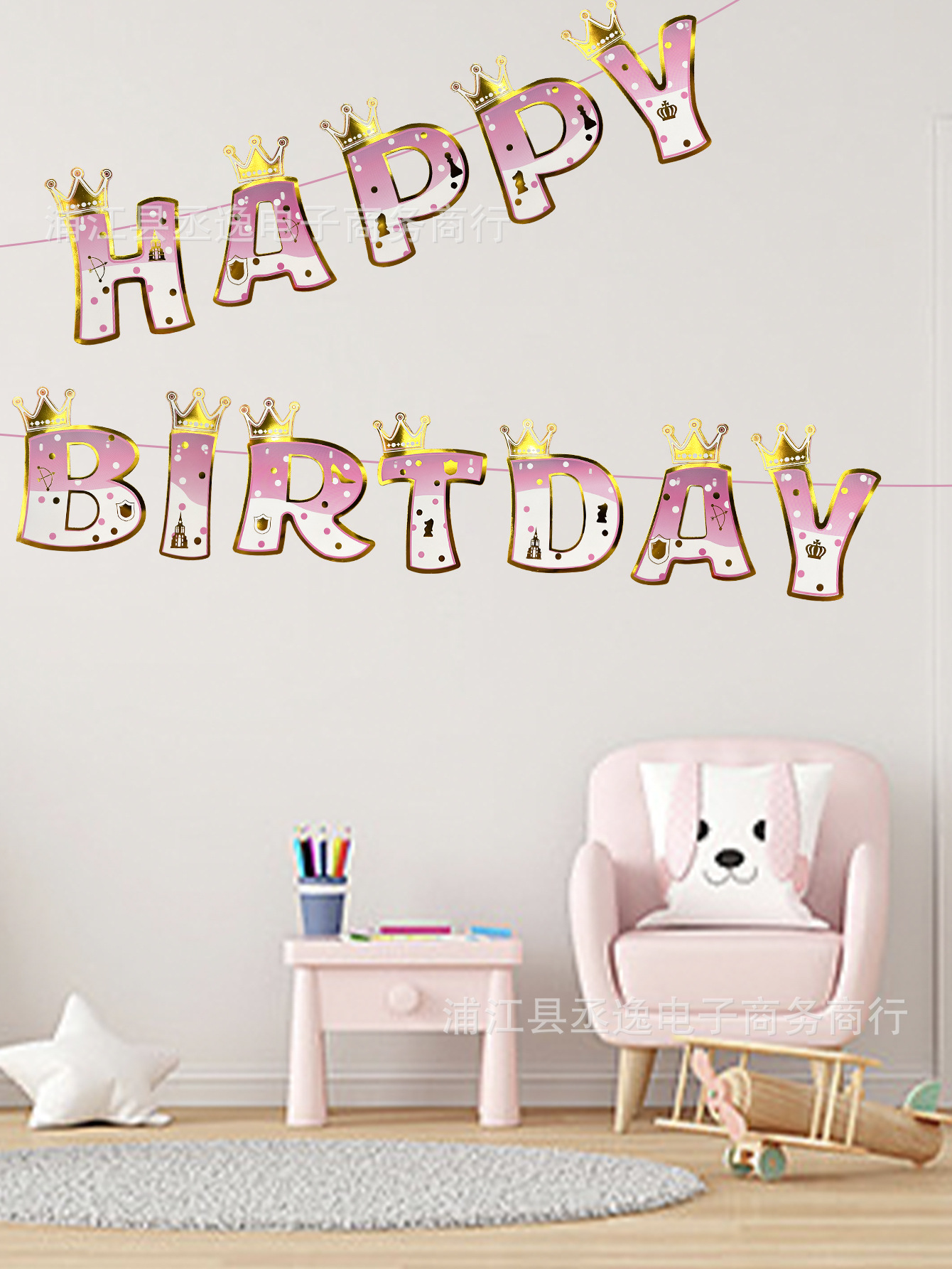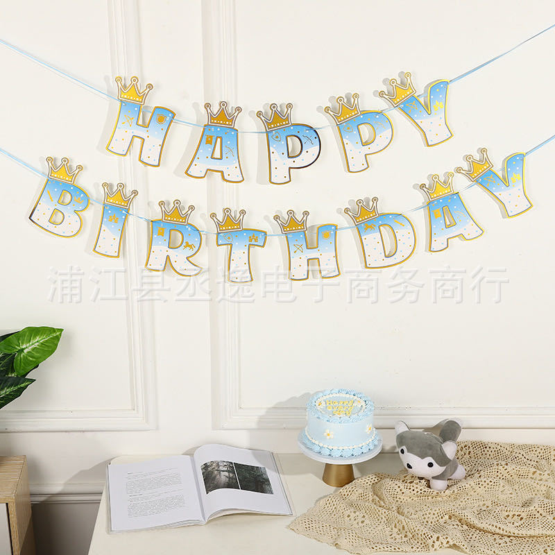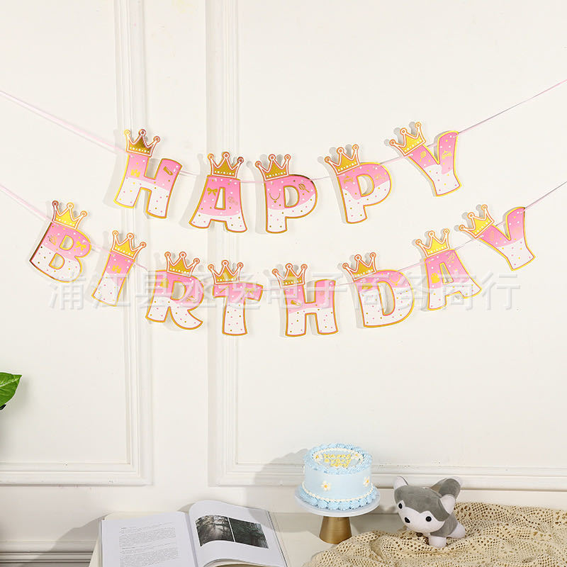 Cross-Border New Pink Blue Crown Happy Birthday Flag Birthday Party Decoration Background Arrangement
